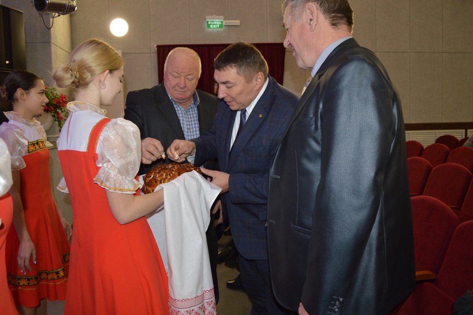 Торжественное мероприятие началось с Гимна России и традиционного приветствия хлебом-солью почётных гостей.